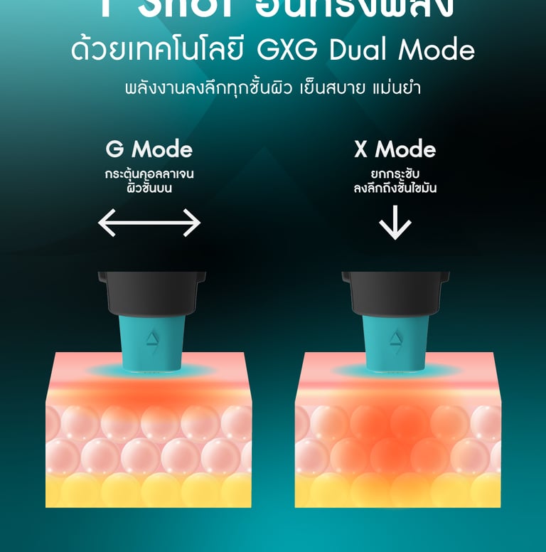 ยก ด้วยเทคโนโลยี GXG Dual Mode 3 Step ปล่อยพลังงานได้มากขึ้น ยิ่งได้ลึกขึ้น แต่ไม่ระคายผิว ให้ผลลัพธ์ชัดเจน ช่วยกระตุ้นและฟื้นฟูผิว